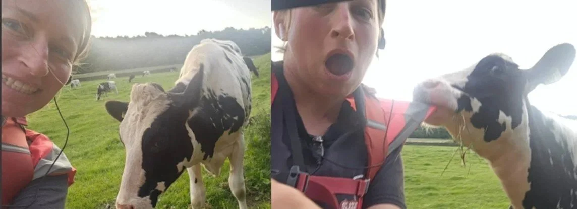 Abi Knapton smiled over two unforgettable photo updates from teammate Kim during a recent route-marking job… featuring some curious (and hungry) bovine spectators 🐮.